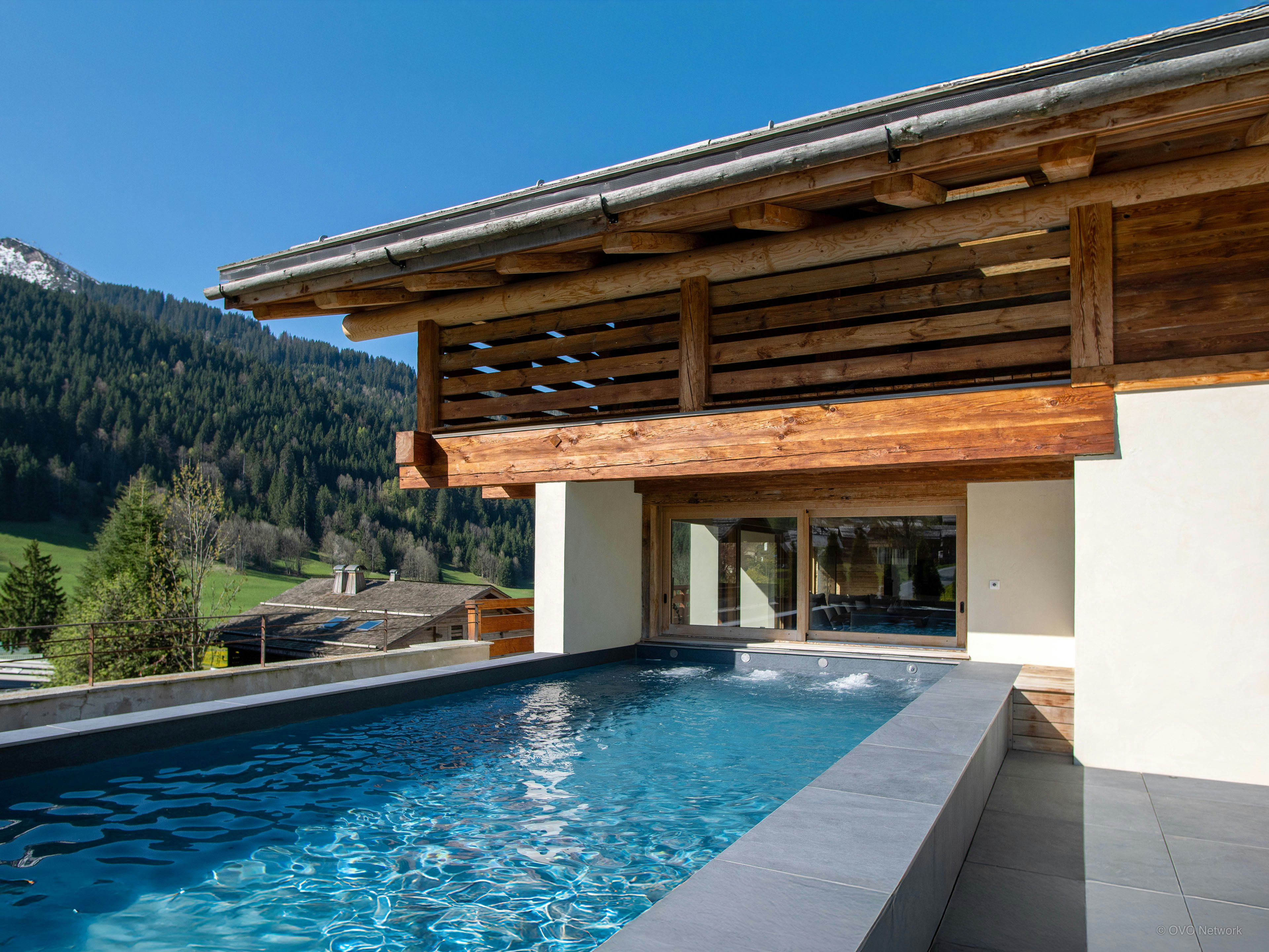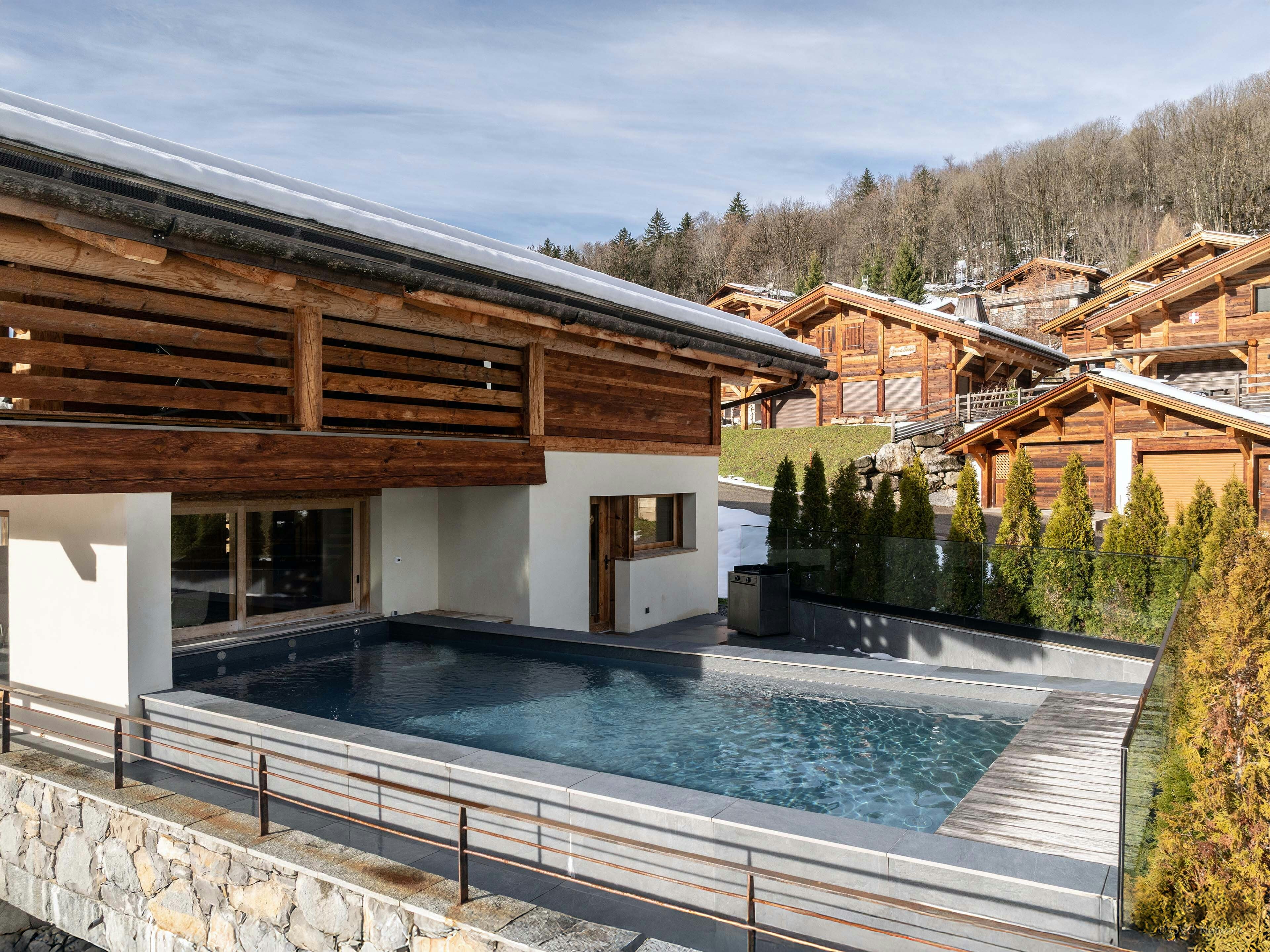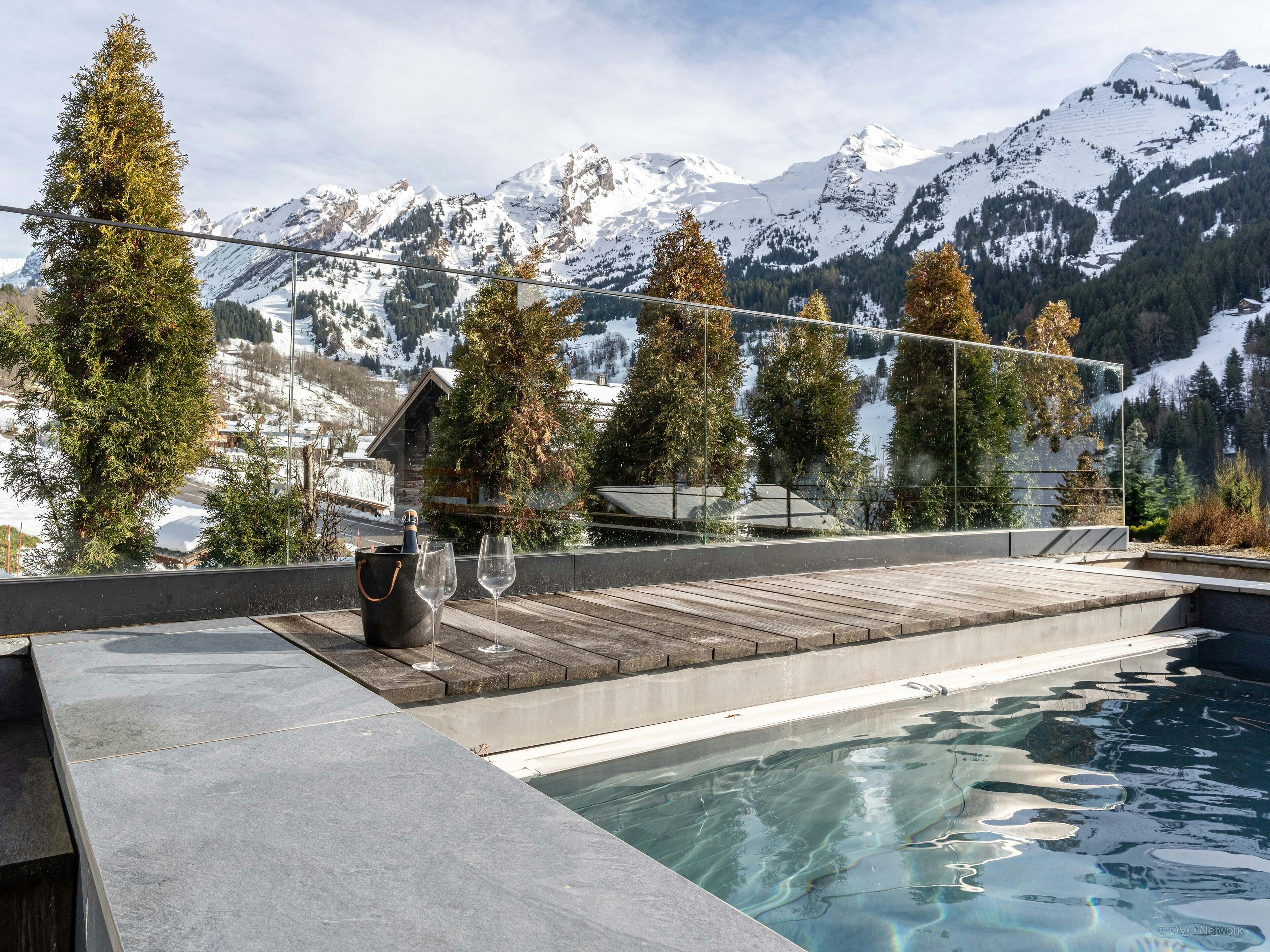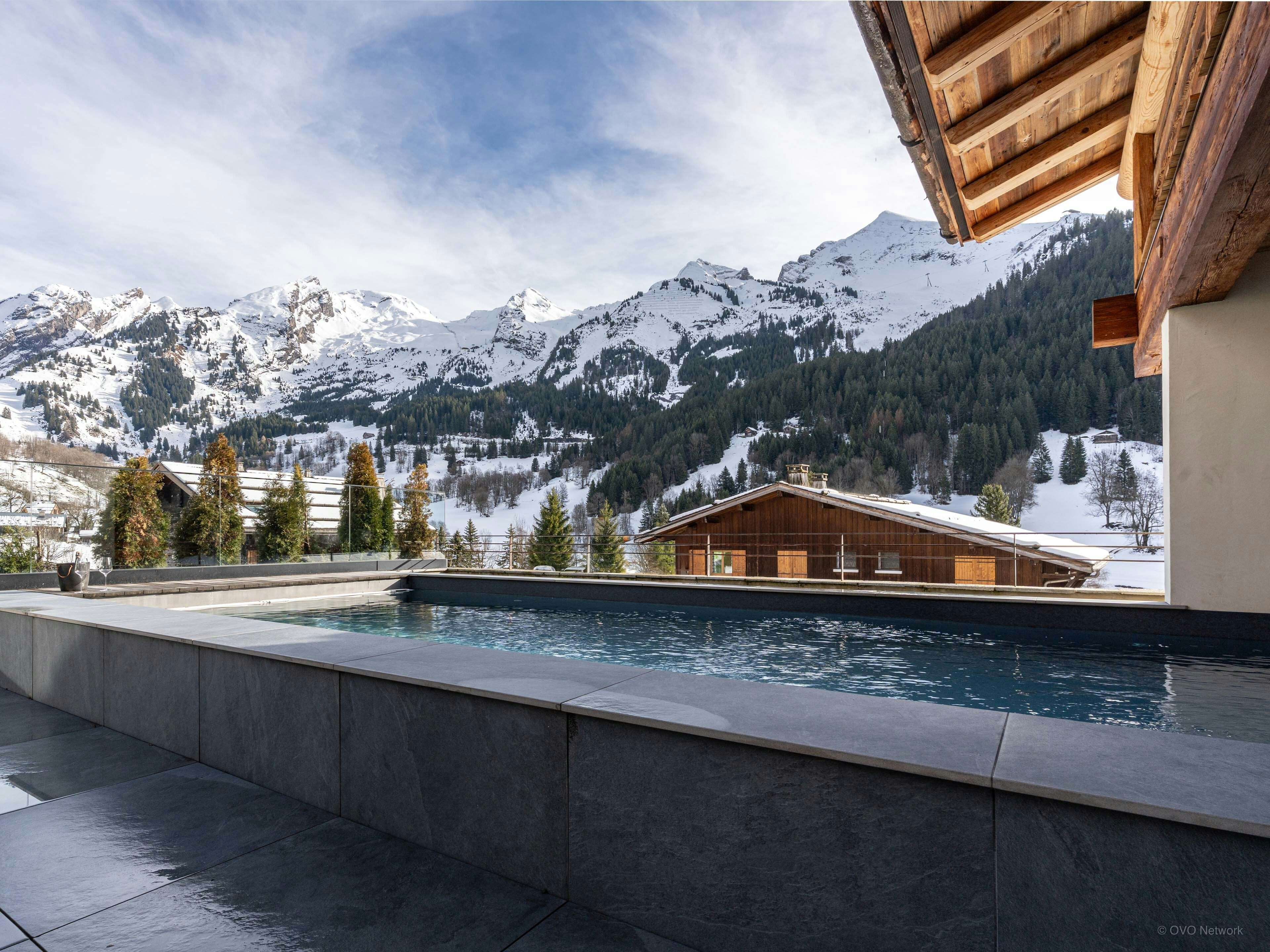 Large windows in the expansive living area fill it with light and frame the surrounding landscape. Outside, the heated pool is the place to relax, with panoramic mountain views all year round.