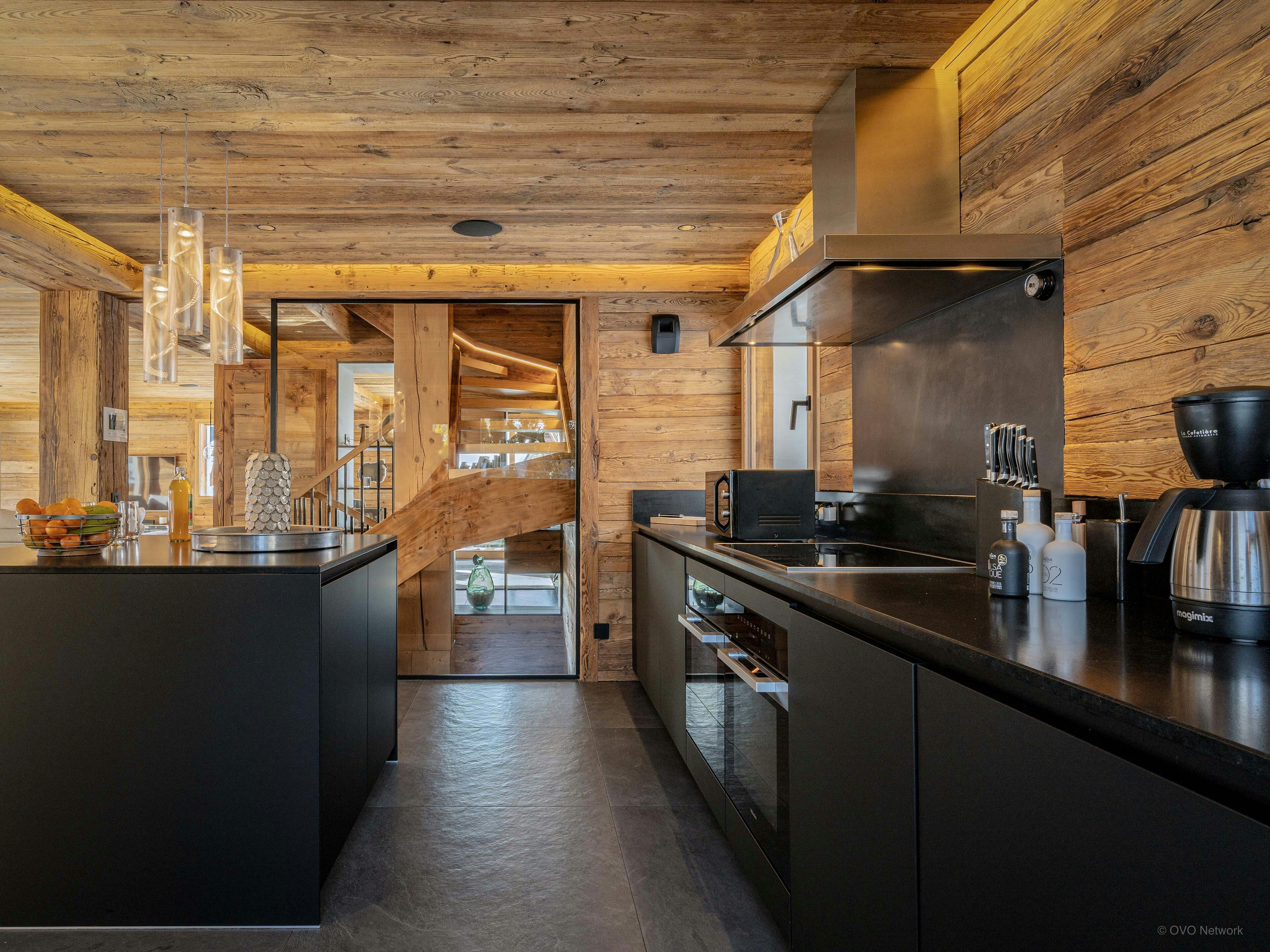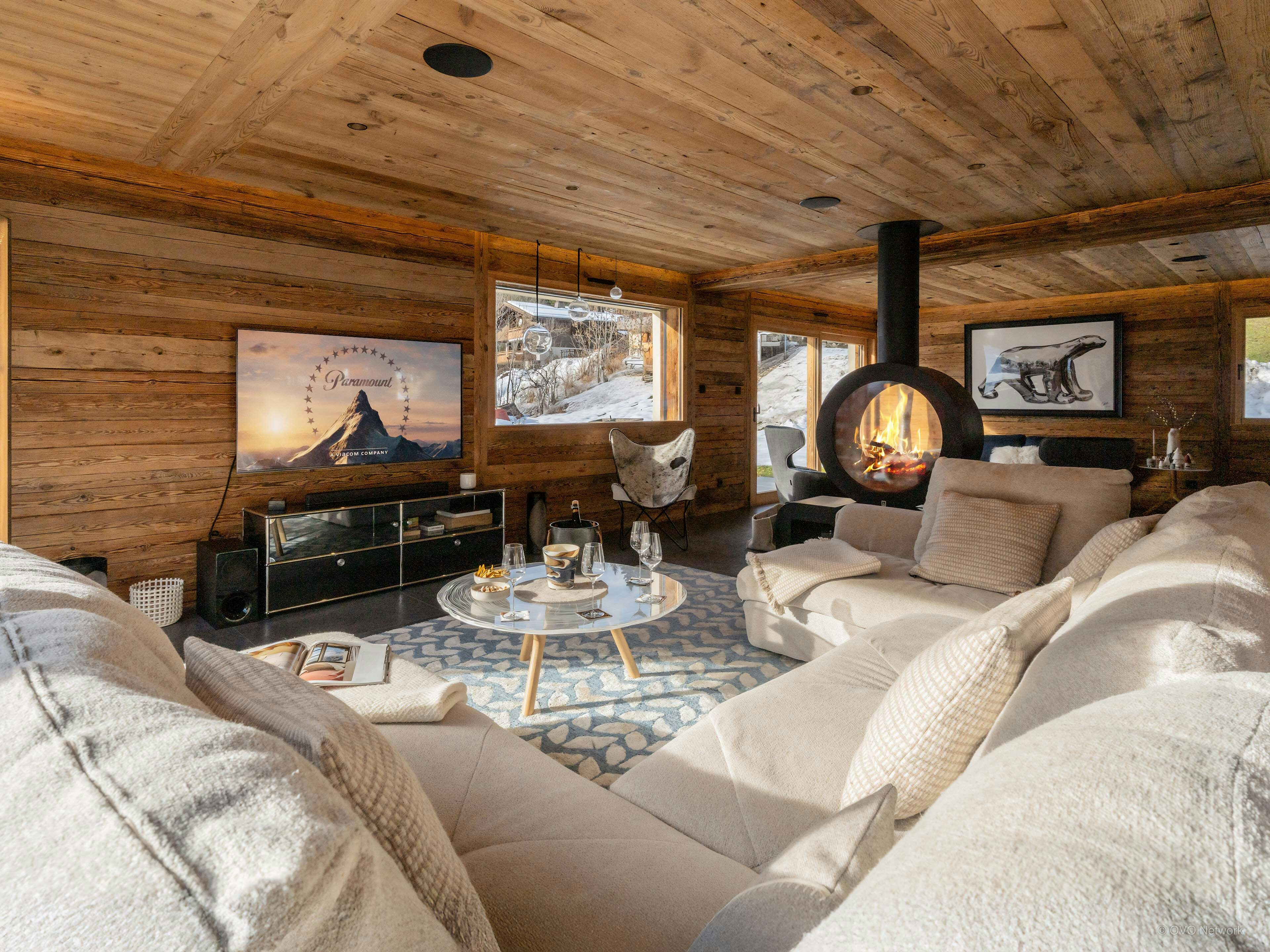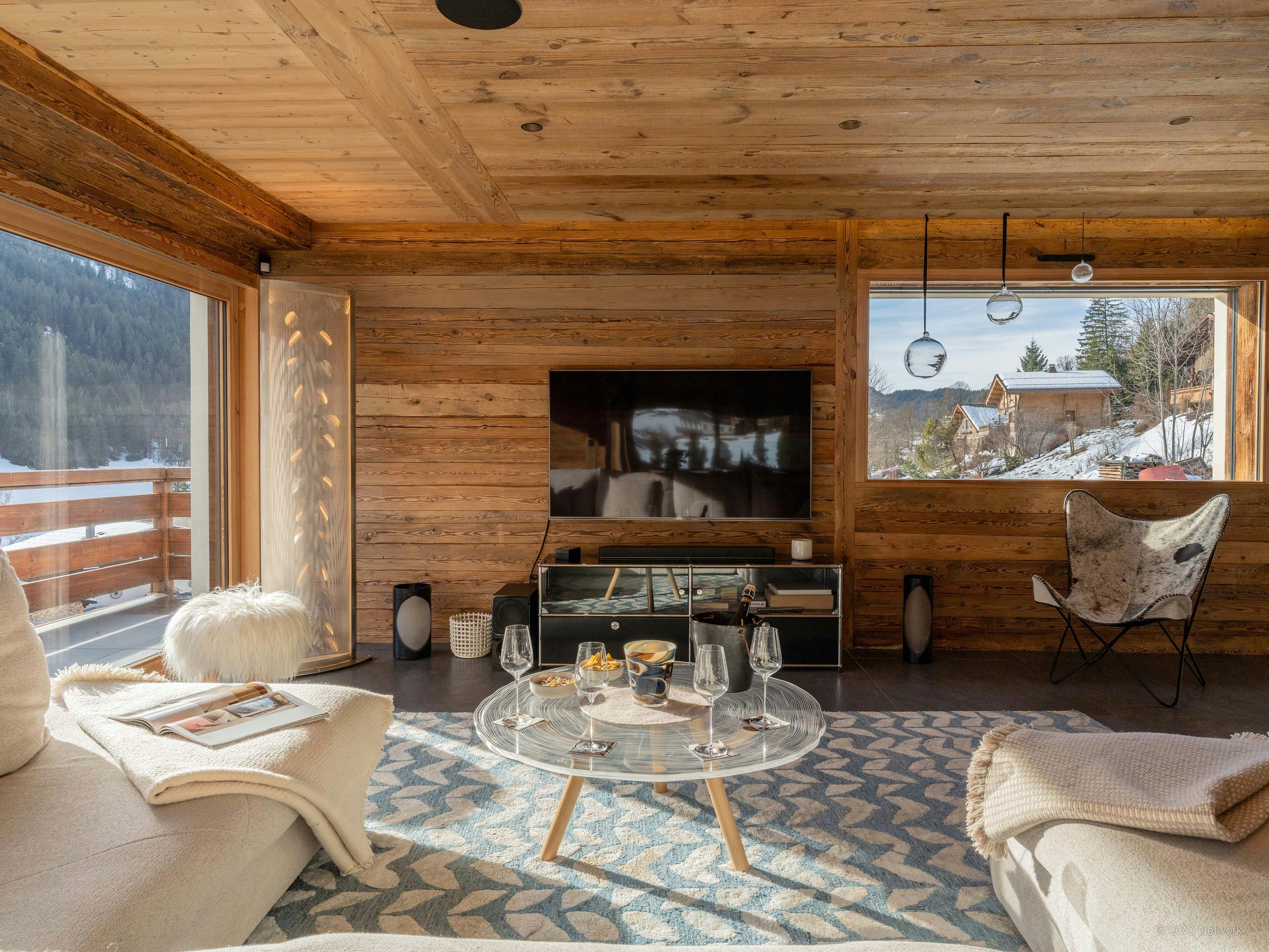 The garden level is surrounded by a balcony/terrace with panoramic views. Large windows frame the mountains and fill the spacious open-plan living area with light. Two seating areas, separated by a suspended fireplace, mean you can get together and watch television in one or curl up with a book from the library in the other. The fully equipped kitchen opens onto a dining table large enough for everyone to eat together. And when it’s time to relax, you’ll find the heated swimming pool on the terrace.
