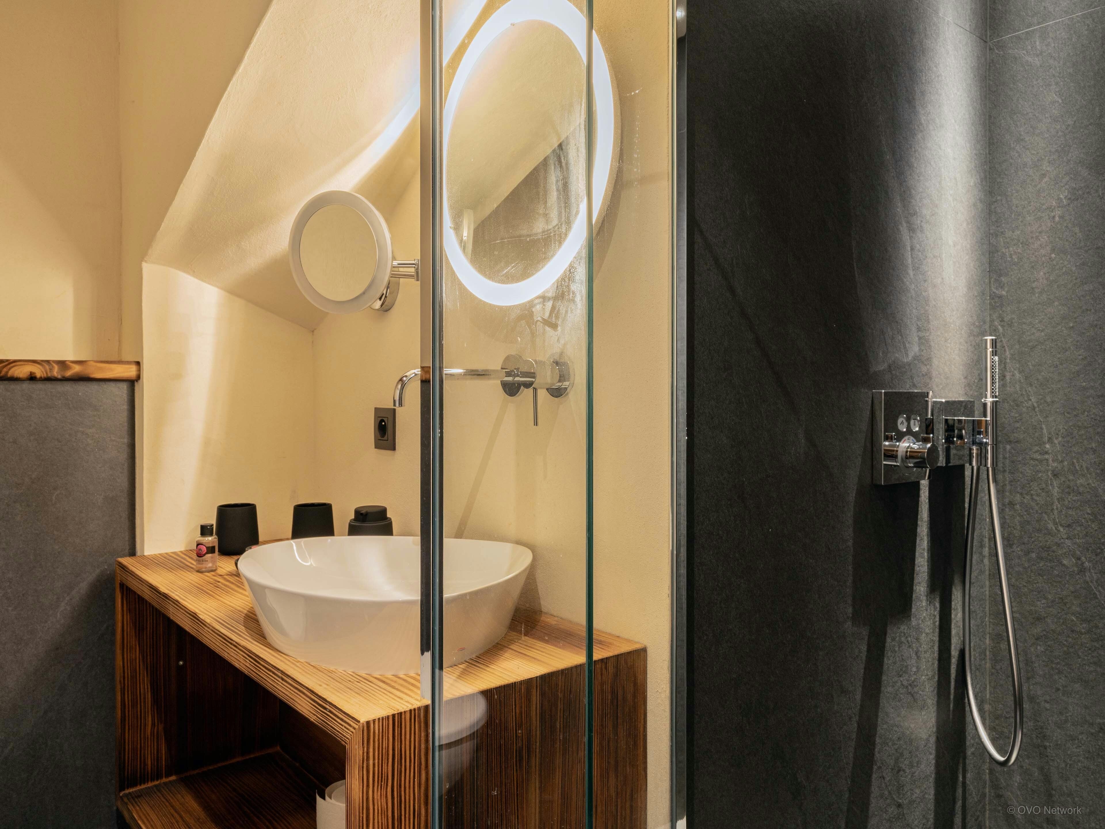 The ground floor houses the first bedroom, a children’s room with six single beds and a television, as well as access to a shower room with WC. The sauna and a well-equipped gym are also on this floor.